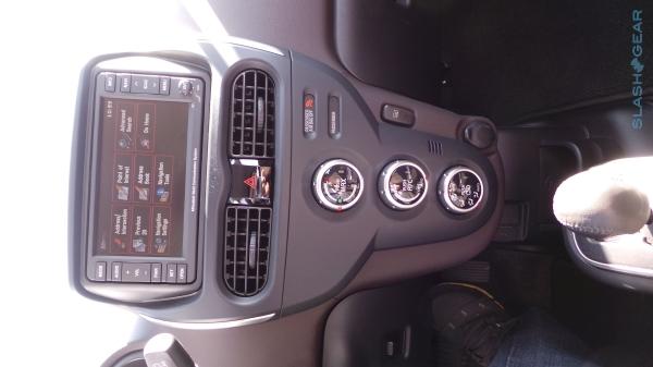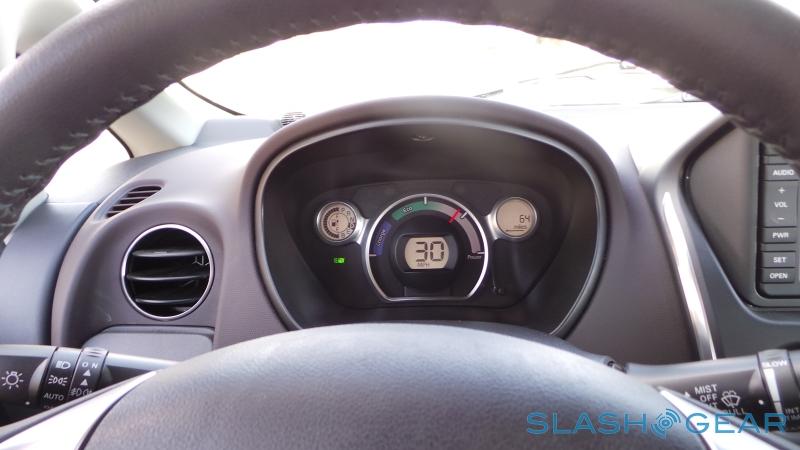 In the minimalistic driver's instrument binnacle the view is dominated by a center gage with a digital speedo in the middle, flanked by a simple indicator which shows how economical or profligate you are with your current driving style. A smaller display on the left shows battery level and current gear; range in miles is shown in another screen on the other side. Jabbing at a small plastic button in the binnacle flips over to distance traveled since your last charge.
