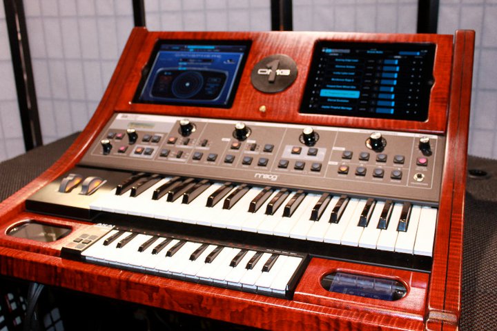 The setup is running the Moog Little Phatty analog synth, Spectrasonics' Omnisphere software synth, and the new Omni TR iPad app. All of the pieces fit together into a gorgeous, hand-crafted curly maple cabinet, complete with twin keyboards.