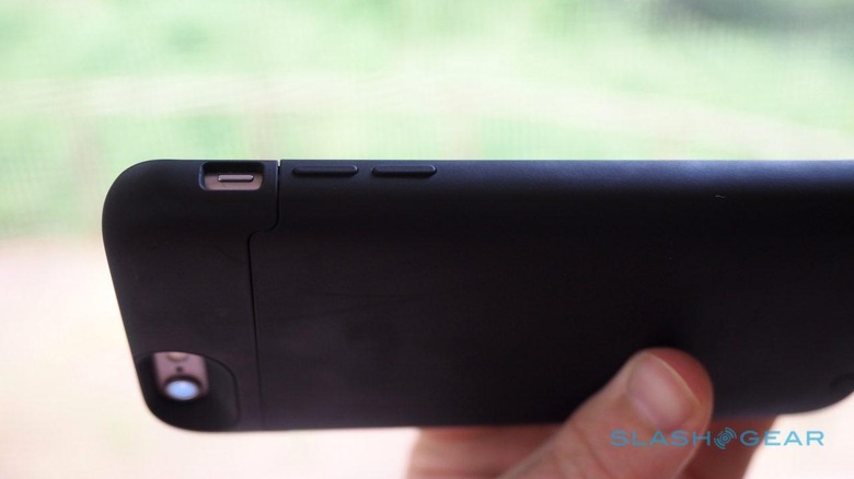 The design won't turn any heads. Soft-touch black plastic, easy to slip in and out of a pocket but a magnet for fingerprints and smudges, with a panel that unclips at the top – with a little yanking – so that you can slide in your iPhone. A hole through which you toggle the ringer switch, pass-through buttons for power and volume, and grilles for the speaker and microphone are all present, as is a hole through which you access the headphone jack. Mophie includes a short extender cable should your headphone plug be too wide to fit through.