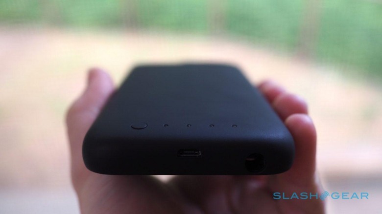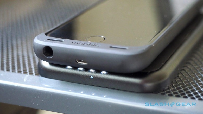Since Mophie doesn't get to enjoy the same iOS integration the Smart Battery Case does, it shows its power status through a row of four white LEDs on the lower back, which light up when you press a button alongside; on the iPhone 6s case, holding down that button turns on or off the battery supply to your phone, while the 6s Plus Juice Pack has a separate switch. On the bottom is a microUSB port through which you can charge the Juice Pack Wireless and your iPhone simultaneously.