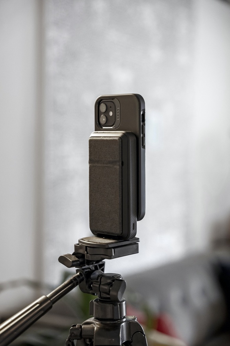 Finally, the Snap+ Powerstation Stand ($69.95) is the most complex of the new range. It's both a desk-stand and a 10,000 mAh battery, with 7.5W of wireless charging support for iPhone and 10W for Android. It can also deliver up to 20W via USB-C PD. Underneath, there's a standard one-quarter inch tripod socket; Mophie is pitching it as the perfect accessory for vloggers, who want a way to both mount their phone for video streaming and to also not have to worry about running low on battery while they do it.