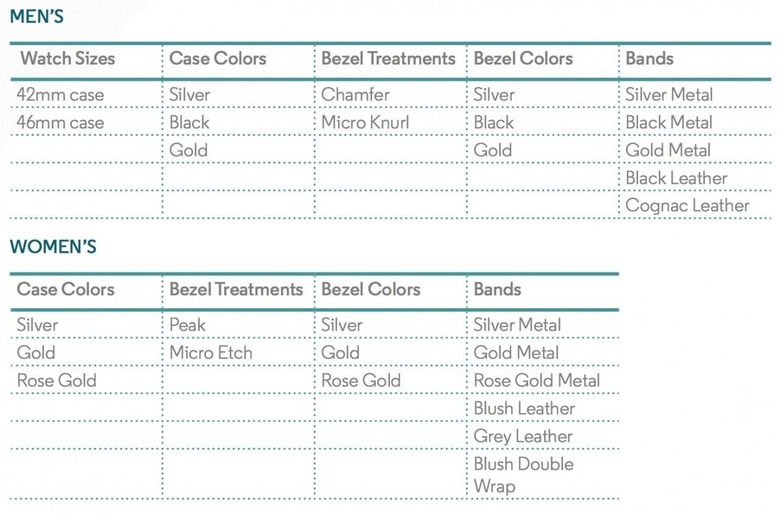 The women's version of the watch works with a 16mm band, while both men's models work with a 22mm band, and all are replaceable.