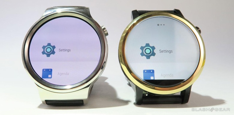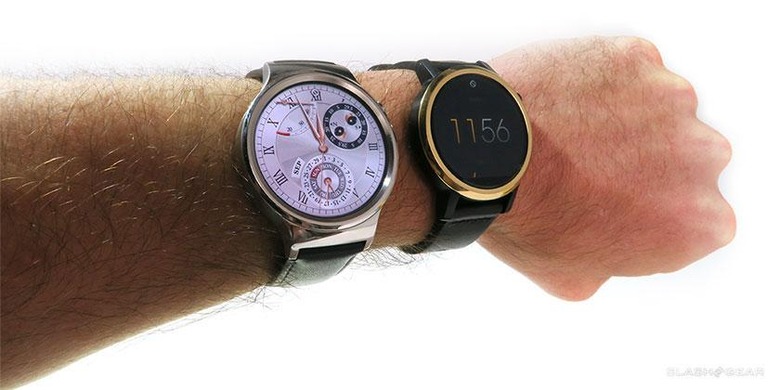 Then there's the exceedingly similar Huawei Watch, a device that sizes in at 42mm with a display at 35.56mm, but whose case has many of the same cues as this year's Moto 360. Don't be fooled by the placement of the single hardware button – these two devices are very different when you get up close and personal with them. Have a peek at our Moto 360 (2015) vs Huawei Watch hands-on for more photos and detail.
