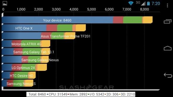 We've taken just a moment to test the benchmarking power of this device, this attained with the standard Quadrant app right out of the box. This device works with a Qualcomm Snapdragon 400 quad-core processor, surprisingly well above last year's Qualcomm Snapdragon S4 present in the HTC One X you see beating up the charts in this basic collection of previous devices.