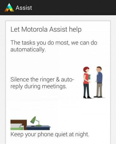 Under the hood you will not find the camera flick-on feature from the Moto X, but you will find Motorola Assist. With Motorola Assist you will not have the ability to turn music on when you begin to drive your car (as the Moto X is able), but you will be able to access the "Meetings" and "Sleeping" features for sound control using your clock and calendar.