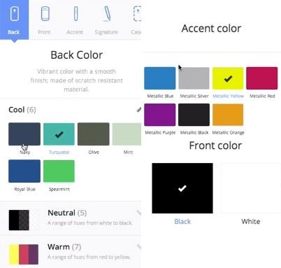 After that there's a choice of 2 different front colors – black or white. Next are accent colors, this including a range of 7 metallic tones: blue, silver, yellow, red, purple, black, or orange.