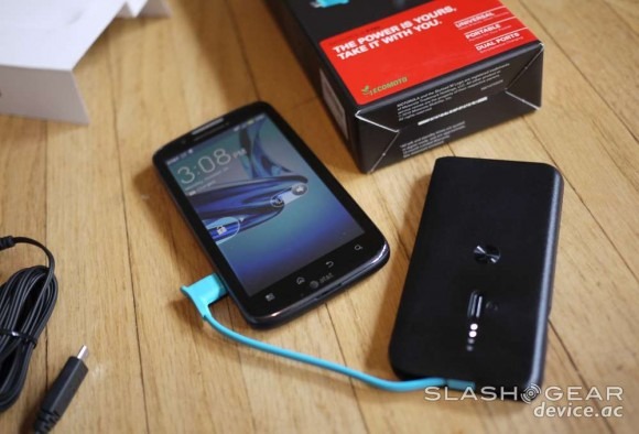 The Universal Portable Power Pack is a device you may have seen before in different forms, this one is essentially a 1420 mAh battery that, when plugged into your ATRIX 2's microUSB, pumps your battery back up to nearly full. There's also a full-sized USB for if you want to charge up a second device at the same time (separate microUSB cord required). One button, lights indicating how much power is left, and a lovely bright green cord to make sure you don't lose the device in your backpack.