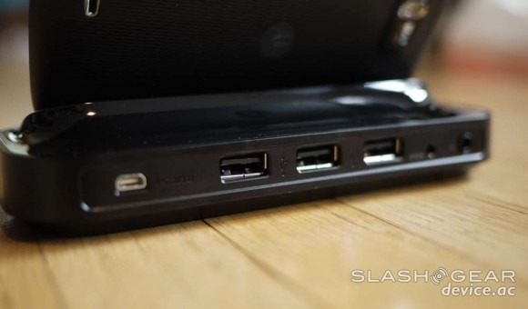 The HD Multimedia Dock – also just called HD Dock in some places, is custom formed for the ATRIX 2. Where I'm sure you'd be able to jam your ATRIX 2 in your original ATRIX HD dock, here its ever-so-slightly updated to fit this device specifically UPDATE: actually the ports are opposite, so the original ATRIX will certainly not fit. It's got a power port for a cord that plugs into your wall (without which you cannot use the dock), three full-sized USB ports (for keyboards and mice and I'm sure video game controllers once Ice Cream Sandwich rolls around), and microHDMI. Since you've already got a microHDMI port on your ATRIX 2 right out of the box, plugging in here will offer 2 possible plusses: accessing Webtop with a mouse and/or keyboard, and having the device stand up so you can use it as a clock – or of course tap away at your Netflix queue in slightly more of a classy way than just doing so with the smartphone sitting flat on your table next to your TV.