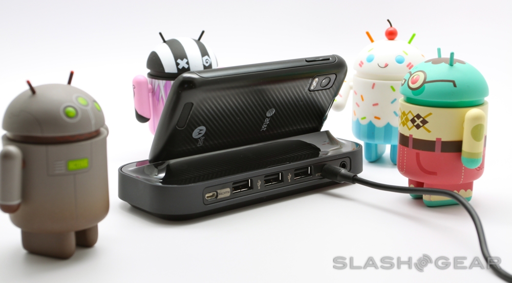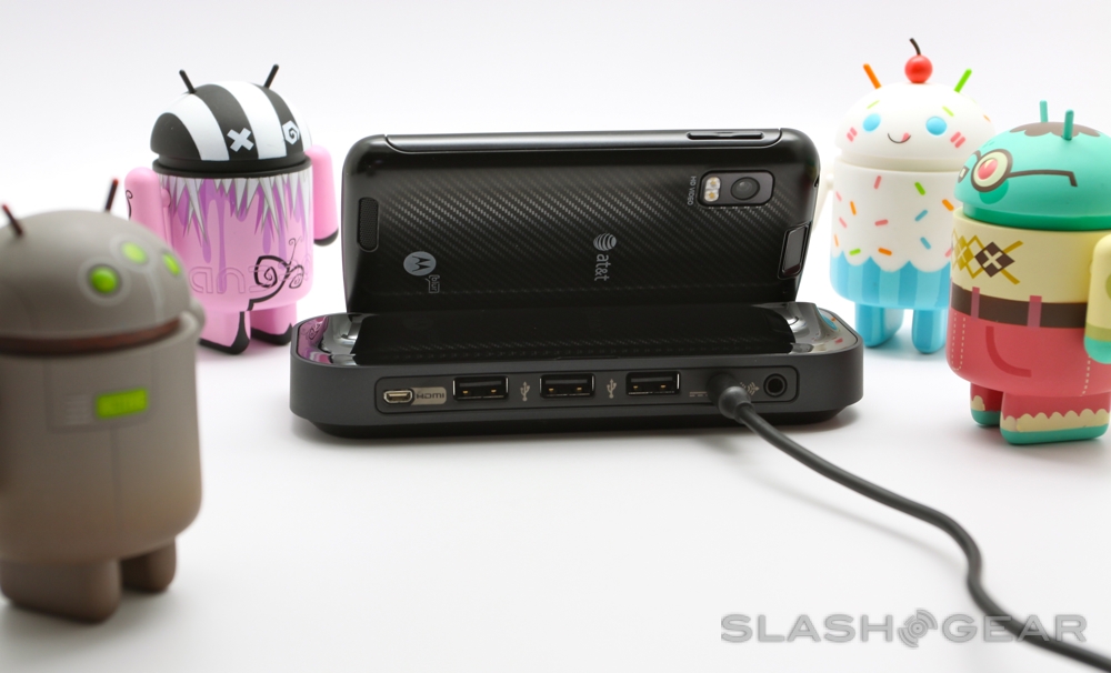 Motorola's desktop dock is a halfway house of sorts between the Laptop Dock and the basic HDMI connection the ATRIX 4G itself offers, including not only an HDMI output but three USB ports for hooking up peripherals and a 3.5mm stereo audio output. They could include a wired keyboard and mouse, though Motorola also sent us its Bluetooth keyboard/mouse set.