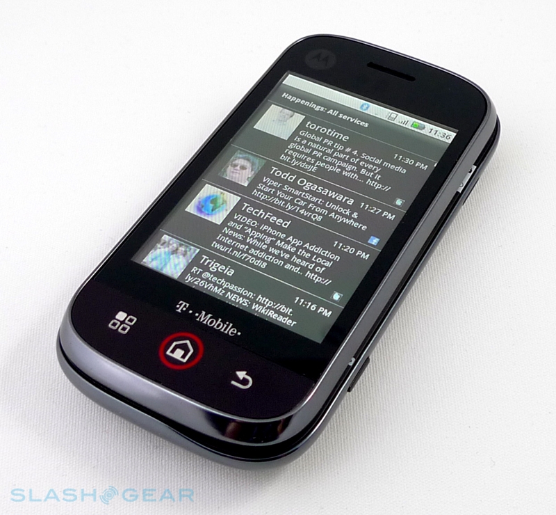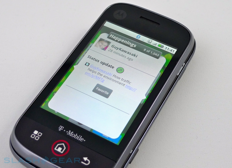 If the CLIQ is Motorola's toe-dipping into Android, then MOTOBLUR is their pledge to stick with the platform for some time to come. There's definitely a sense – both on the device and from talking with Motorola at the respective CLIQ and DEXT launches – that what we're seeing with the aggregation system is but the first step in the company's plans. As it stands, MOTOBLUR pulls in Facebook, MySpace and Twitter messages, status updates and content into a unified inbox, which Motorola call "Happenings". A desktop widget brings that stream directly to the Android homepage, while there are also individual app-specific widgets to pare down the flow. We wish there was a way to define our own filters, however; for instance, you can have a "direct message" Twitter widget, but not one that only shows any username mentions; nor can you prioritize specific contacts and pull out any updates they make into a separate window.