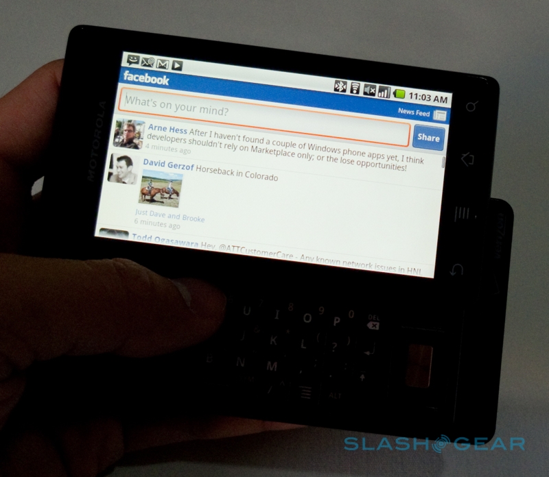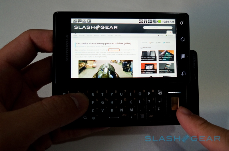 In a hardware design so considered, there are also some baffling layout decisions, not least the positioning of the D-pad. Seldom used – in fact both Sony Ericsson and Acer have dropped the hardware directional control from their own Android devices – it shares the same poor tactile feedback as the QWERTY but also forces the keyboard across to the left. That leaves you constantly reaching across it with your right thumb. Less annoying, but no less puzzling, are the two blank keys in the bottom left and right corners of the 'board; considering Motorola were sensible enough to fit in shift and alt buttons on both sides, we can't help but wonder why they didn't use these blanks for shortcuts or the like.