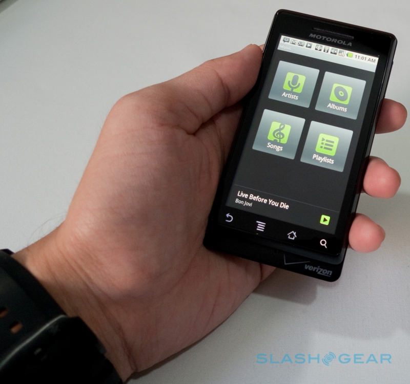 Speaking of media, Android's PMP functionality is strongly in need of an overhaul, both in terms of the onboard applications and the way you manage your audio, video and picture content. Aside from being relatively ugly compared to other aspects of the OS' design, the media player lacks the flexibility you'll find on an iPhone. Managing on-device media and transferring content between your computer and the DROID still requires either drag-and-drop over a USB connection (which mounts the DROID and its memory card as an external drive) or physically taking out the microSD card and using a standalone card reader. We can't imagine many people opting for the latter, however, as access to the memory card demands you not only remove the battery cover but the battery itself. It was enough trouble getting the battery cover to stay on anyway; we had to bend the four metal prongs outward slightly in order to keep it fixed in place. Happily, there's a standard 3.5mm headphone socket, though Motorola don't actually include a wired hands-free kit. Having tried the bundled headphones of more cellphones than we could count, that's no great issue when it comes to quality sound – just about any aftermarket pair will outclass what's usually thrown in free – but some buyers may resent it all the same.