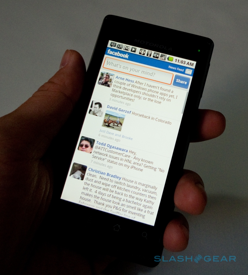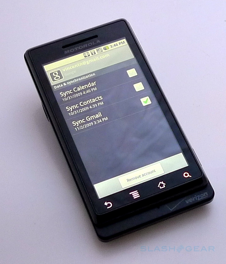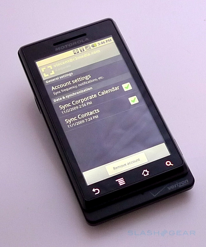 While MOTOBLUR may not be present, that doesn't mean social networking is completely absent from the DROID. Android 2.0 integrates Facebook, for instance, into the contacts, pulling in any email or number information together with their latest status update and profile photo. The new OS also natively supports Microsoft Exchange for email, calendar and contacts, but there's a split in consistency in terms of what's kept separate and what's merged. Exchange email and contacts are merged in with the rest – individual address book entries are combined rather than causing duplicates, and tapping on a person's photo pulls up a floating Quick Contact bar with shortcuts for email, SMS or whatever methods are available – but the Exchange calendar is separate from the personal calendar. Meanwhile Gmail is corralled into its own app, separate from Exchange, POP and IMAP accounts.