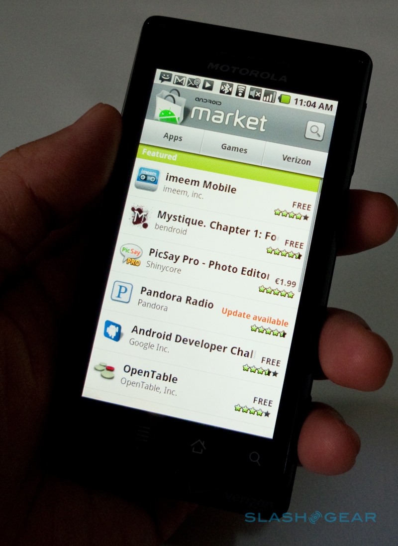The remaining changes in Android 2.0 are less obvious, and while that means there's sometimes a nice surprise to be found – Object Push and Phone Book Access profiles freshly added to the platform's Bluetooth support, for instance – it also means some elements are left wanting. The Android Market continues to grow in content, much of which is free, and thanks to the UI update in Android 1.6 is an easier, more pleasant place to navigate and download from. However, Android 2.0 still has the app limitation whereby software can only be loaded into the phone's memory: the DROID has 512MB of ROM (and 256MB of RAM), and while Motorola bundle a (sluggish) 16GB class 2 microSD card in the box, it's only of use for media files rather than software.