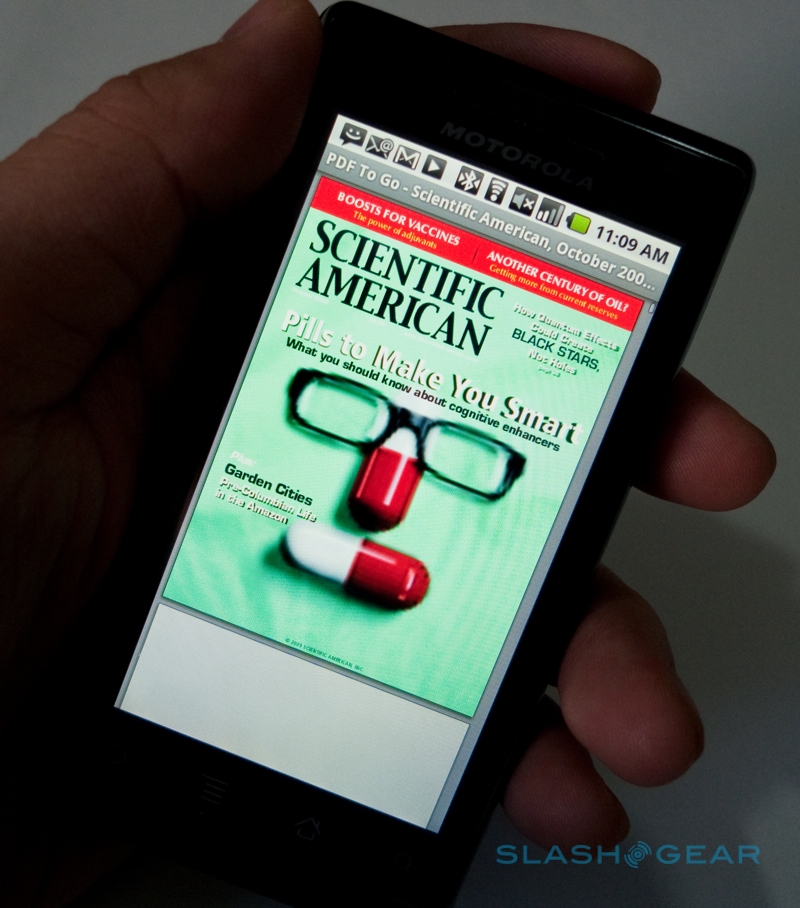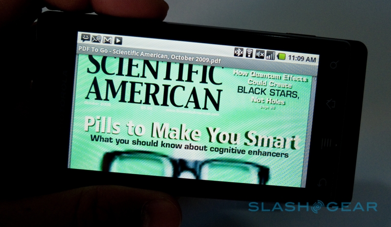 Pride of place is the DROID's display, a 3.7-inch 854 x 480 capacitive touchscreen that's incredibly bright and crisp. We're used to AMOLED panels taking the top spots when it comes to display technology, but Motorola's choice of LCD is particularly impressive. Switching back to an iPhone 3GS really shows the difference in screen resolution; thanks to sheer size and pixel density, it's possible to read some PDF or Word files full page without any zooming.