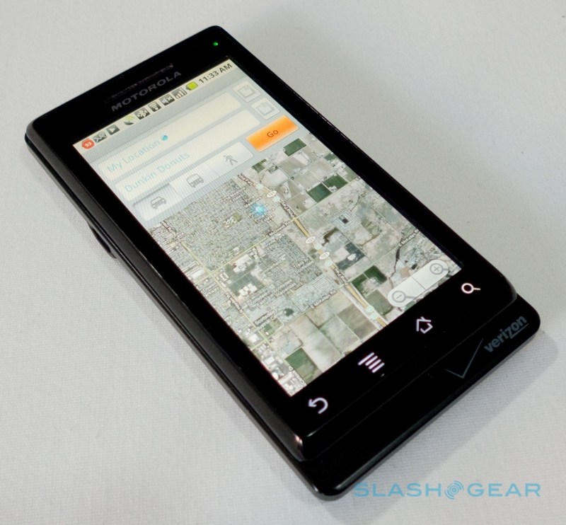 One of the most discussed features of Android 2.0 is Google Maps Navigation, currently in beta in the US (those who pick up the non-US version of the DROID, when it launches, will get Motorola's own MOTONAV GPS app). This adds voice prompts, turn-by-turn navigation, text-to-speech and voice-control to Google Maps with no monthly subscription or fees beyond your data package. As usual, Google Maps offers various mapping types, from the basic layout to satellite and traffic overlays, and there's a digital compass for use with Street View.