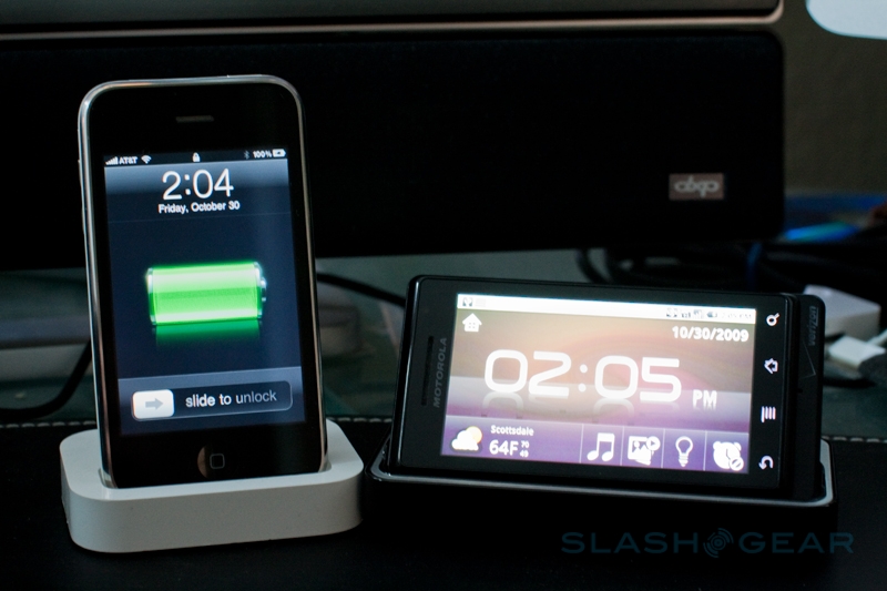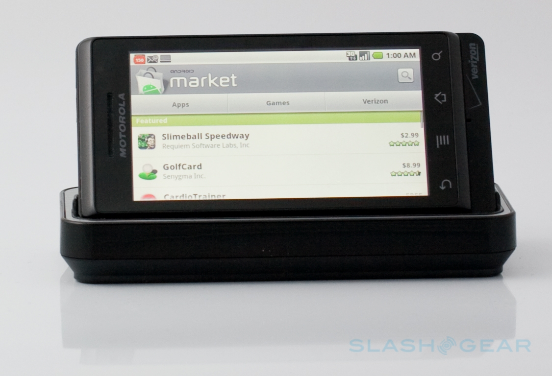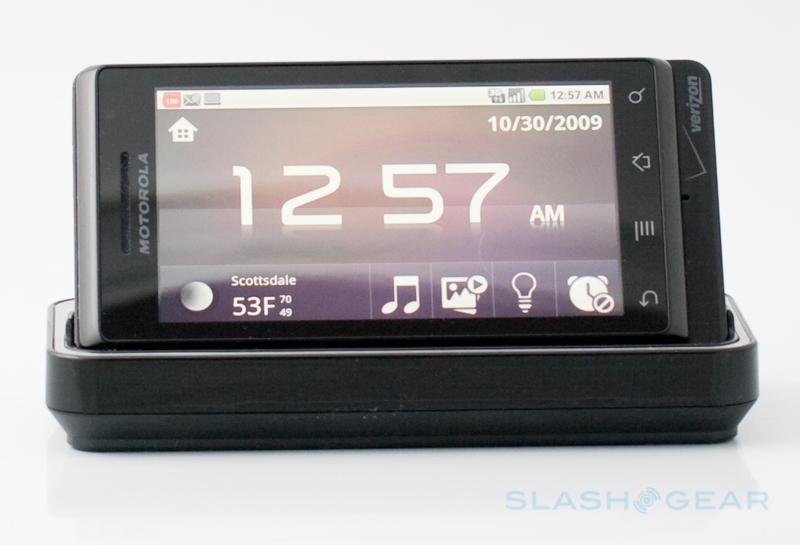 Verizon will be offering two accessories for the Motorola DROID on launch day, a desktop docking station and an in-car mount. The former holds the DROID in landscape orientation and – thanks to a carefully placed magnet – automatically triggers a desktop UI with prominent clock, date, weather widget and access to media playback and an alarm. Around the back there's a single microUSB port for recharging/syncing, though we wish Motorola had either fitted a second battery slot or even built a battery into the dock itself, along with a speaker. That way the dock would've made for a handy travel companion, propping the DROID up at a video-friendly angle while also avoiding running down its onboard battery.