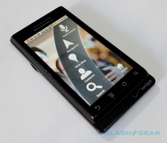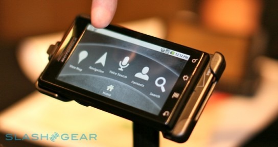 The in-car mount, meanwhile, uses the same sort of magnet trick to kick the DROID into navigation UI with chunky, finger-friendly buttons ideal for using while driving. There's also easier access to voice-command, and unlike the desktop dock there isn't a microUSB port to charge the DROID. Unlike, say, TomTom's iPhone car kit, however, there's no GPS receiver or speakerphone, though thanks to the DROID's excellent onboard speakerphone the latter would be a wasted effort. Each accessory is expected to come in at $30.