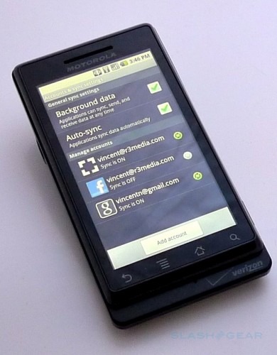 While MOTOBLUR may not be present, that doesn't mean social networking is completely absent from the DROID. Android 2.0 integrates Facebook, for instance, into the contacts, pulling in any email or number information together with their latest status update and profile photo. The new OS also natively supports Microsoft Exchange for email, calendar and contacts, but there's a split in consistency in terms of what's kept separate and what's merged. Exchange email and contacts are merged in with the rest – individual address book entries are combined rather than causing duplicates, and tapping on a person's photo pulls up a floating Quick Contact bar with shortcuts for email, SMS or whatever methods are available – but the Exchange calendar is separate from the personal calendar. Meanwhile Gmail is corralled into its own app, separate from Exchange, POP and IMAP accounts.