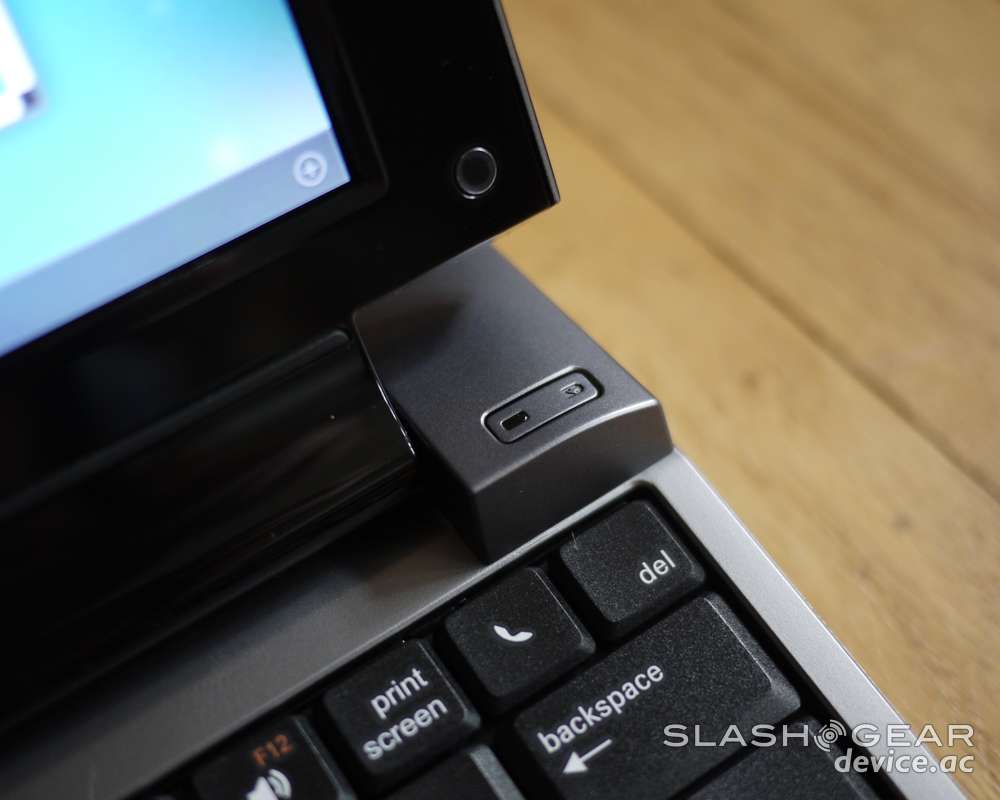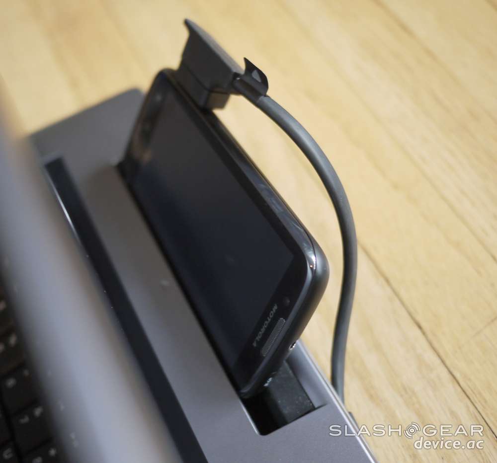 Though I've got a couple of compatible Motorola devices to test with the Lapdock, unless otherwise noted I'll be working with the ATRIX 2, a device that either also is or will be soon posted on MMtech Online in a full review as well. One of the most instantly apparent differences between this Lapdock and the one that came out earlier this year with the original ATRIX is the amount of devices that are compatible. This new round of Webtop Laptops has a cord that plugs into the microHDMI/microUSB port combo that the newest round of Motorola smartphones have, and contrary to what we saw at the DROID RAZR release, the device doesn't then just have to sit on the table. Instead, as you can see, there's a rubbery-material-coated opening behind the display, right above the cord, that allows you to pocket whichever smartphone you've got plugged in.