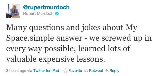 Outspoken News Corp. CEO Rupert Murdoch has given a blunt summary of the MySpace debacle, describing the company's attempt at the social networking market as having "screwed up in every way possible." Murdoch took to Twitter to answer "many questions and jokes" about MySpace, which News Corp. acquired back in 2005 for $580m. "[We] learned lost of valuable expensive lessons" the exec admitted.