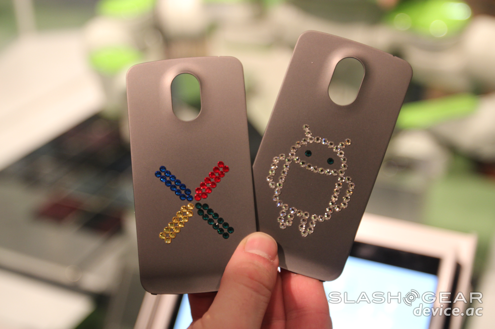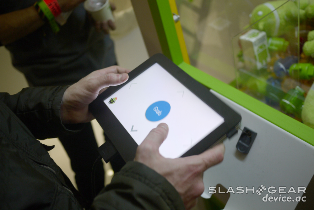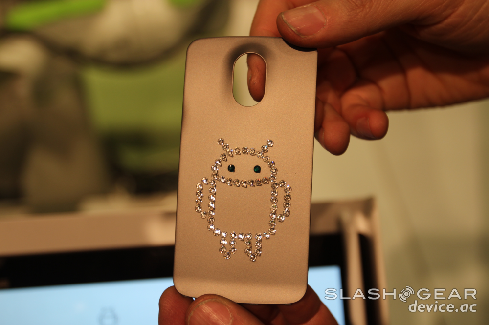 Also along those lines there's an Android tablet-controlled robot in the center of the room picking up Galaxy Nexus battery covers and placing them down to be bejeweled according to a series of Android-related designs that the user can choose from. These design were made by – you guessed it – Android Bell, and because so many people wanted to get their hands on one of these magical items, Google had to implement a giveaway system where people who tried the robot out were put into a hat and chosen at random to win one of their creations.