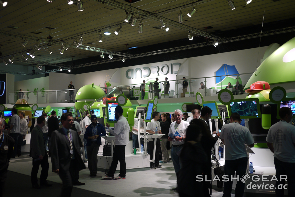 The main bulk of this whole showing is made up of giant Android statues which hold several Android developers each. There's developers of games, Google developers making official Google-released apps, and manufacturers along the back as well. Along the opposite wall of the belt there's an "Android Design" wall which shows off the many strange ways you can use Android to control objects that normally aren't associated with the mobile world, like light switches and non-mobile touchscreens with icons galore floating about.