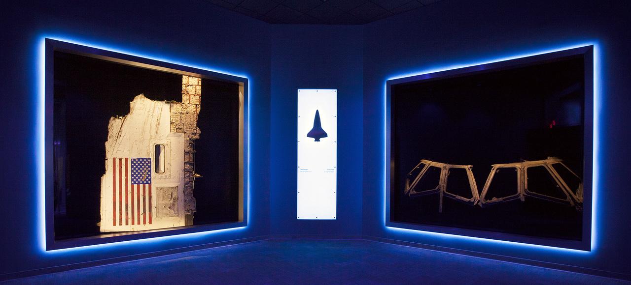 This marks the first time wreckage from the missions has been put on display. The new memorial features a piece of fuselage from the Challenger and the window frame from the Columbia's flight deck. The remainder of Challenger's wreckage is stored in two sealed missile silo complexes, and the debris from Columbia is kept in an office suite at the Kennedy Space Center.