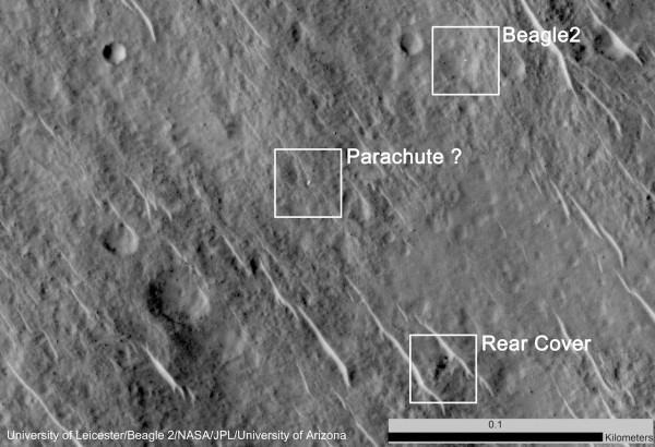The lander made it down within the area intended, and clearly managed to at least partially set itself up. Also visible are what are believed to be the parachute and Beagle 2's rear cover.