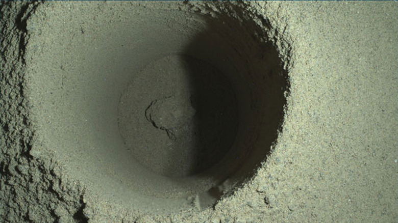 The researchers believe the rock chosen for the first sampling attempt wasn't strong enough to produce a core. In the close-up image of the borehole, we can see that there is some material in the bottom of the hole. The core they hoped to obtain is either in the bottom of the hole, in the cuttings pile stacked around the hole's rim, or is a combination of both places. Ultimately, NASA believes it was the properties of the rock that prevented a core sample from being collected and not a fault of Perseverance. The next sampling attempt will be conducted in September.