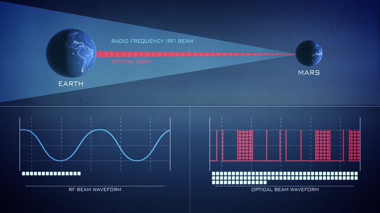 NASA says that using laser communications will enable 10 to 100 times more data to be transmitted back to Earth than current radiofrequency systems can support. Currently, it would take about nine weeks to transmit a complete map of Mars back to Earth using radio frequency systems. If NASA used laser communications to send the same data, it would take about nine days.