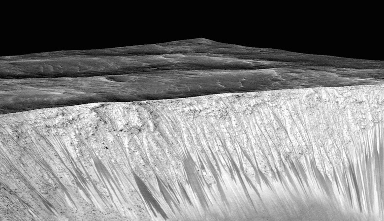 Specifically, NASA is sending Curiosity to investigate recurring slope lineae, or RSL. These are vertical lines that appear on hillsides (seen below), created seasonally when the surface temperature rises enough for water to melt and flow downwards, displacing sand along the way.
