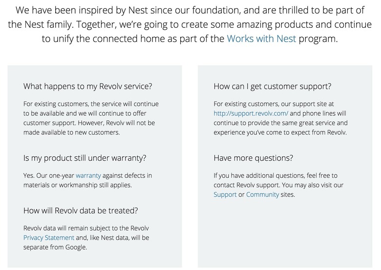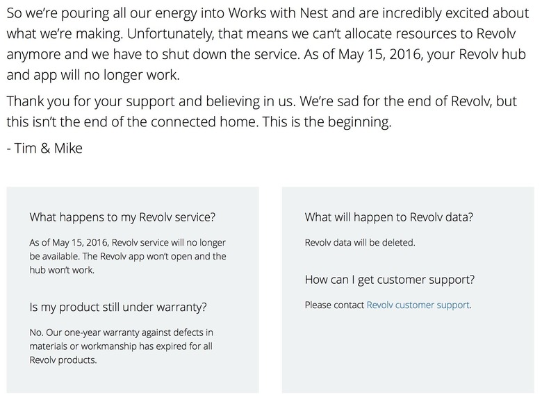 "The Revolv app won't open and the hub won't work," the page highlights, and any user data "will be deleted." All Revolv hardware is now out of the one-year warranty originally offered.