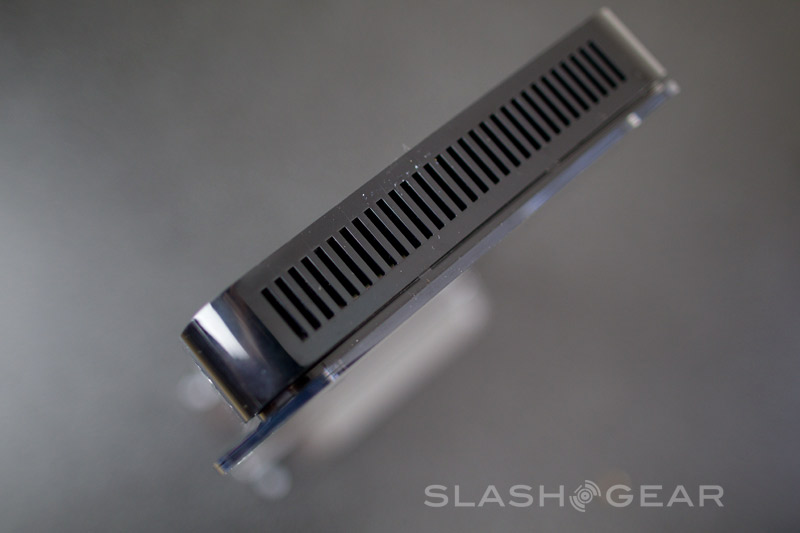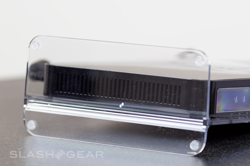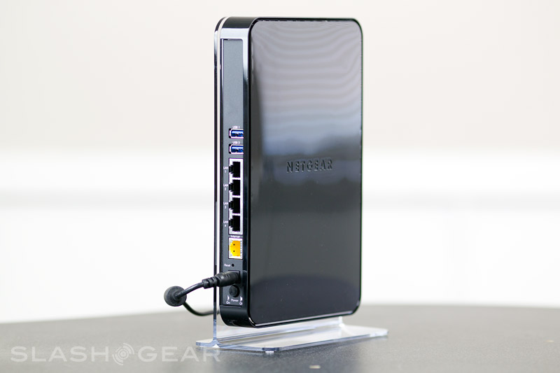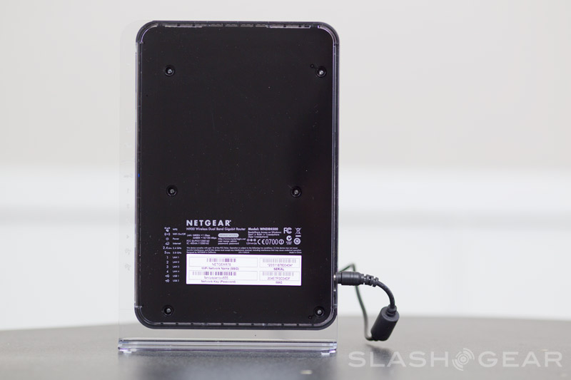 Slim and tall is Netgear's design language right now, with the WNDR4500 a sleekly designed monolith with an integrated transparent plastic stand. Despite the small footprint, it proved stable even with six chunky Cat6 cables hanging off the four gigabit ethernet ports at the back. They share space with a pair of USB 2.0 ports – Netgear tells us this was a performance consideration, rather than USB 3.0 – a gigabit WAN port, power, recessed reset hole and physical power switch.