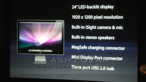 The new Apple Cinema Display is to be 24-inches with a 1920 x 1200 resolution. Stereo speakers are built in and it features LED backlighting. The display also has iSight built-in and a microphone.