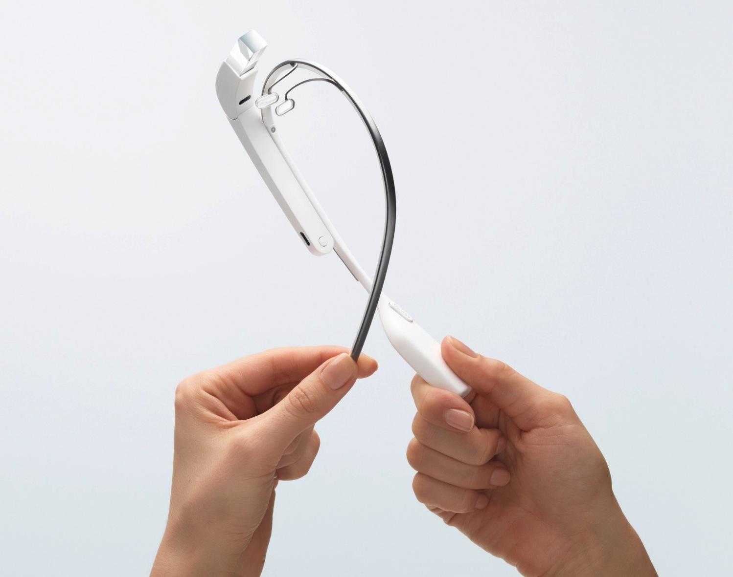Meanwhile, there are new images of the Glass headsets, including five different colors – charcoal, tangerine, shale, cotton, and sky – and seemingly confirming that the wearable will be water-resistant. Considering it's designed to be worn all the time, that's probably a good idea. A version with sunglasses lenses attached is also shown, and we know Google is thinking about prescription lens support too. Finally, the headband itself is seemingly made from flexible metal, for better resilience.