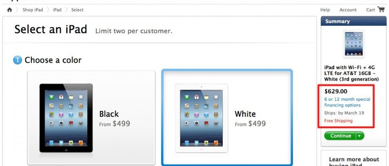 All other color versions, whether WiFi-only or with AT&T or Verizon LTE support, are still listed as shipping for March 16. International sales – in the UK at least – are still showing March 16 for all versions too, though those in the UK have had less time to stretch Apple's launch-day stock: the UK Apple Store only came back online at roughly midnight local time, several hours after pre-sales began in other countries.