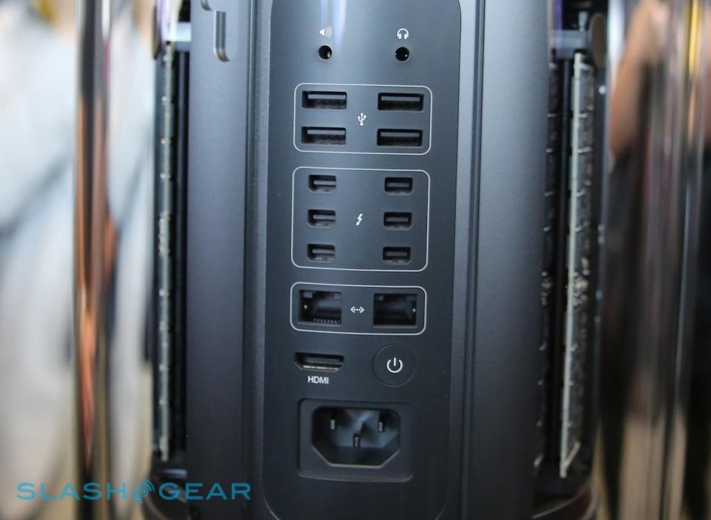 Instead of internal SATA bays for extra drives, the new Mac Pro goes at it from a modular perspective. Six Thunderbolt 2 ports are each capable of handling six individual devices daisy-chained from them; that's a total of thirty six peripherals – hard-drives, A/V interfaces, even 4K displays – that can be strung from the one compact desktop.