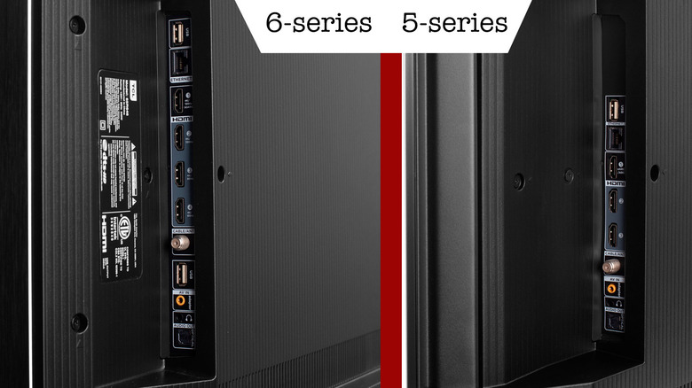 The differences between the 5 and 6-series is in the audio power, the quality of the display panel, and the availability of higher-end HDMI. The 6-series panels work with Natural Motion 480 and panel resolution at 3840 x 2160 (UHD) with 1.07 billion colors, DCI-P3 color, Dolby Vision, HDR10, HDR10+, and HLG. Where the 5-series has a QLED panel, the 6-series has mini-LED QLED.