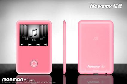 We also see what we guess is a 2-inch screen just above a heat sensitive strip which is located above the round button. The A1 also includes a RockChip RK2705 media chip, capable of playing multiple video files at high resolution along with multiple audio files. This device will be available by the end of January in bother pink and blue.