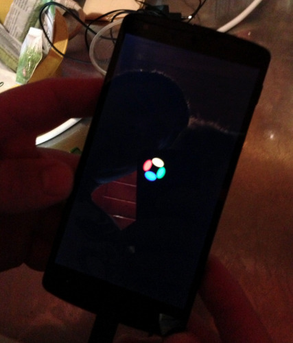 The startup screen (those four colored dots) show the same sort of intro to the device as you'll find on the HTC One and Samsung Galaxy S4 Google Play edition devices. The back also features a "not for sale" indentation and the LG branding we've seen in previous "leaks" – same goes for the Nexus logo in massive letters across the back rather cleverly covered by a sticker.
