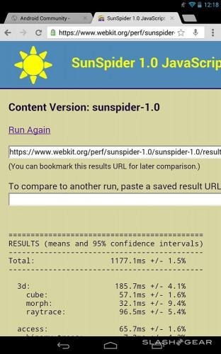 What you're seeing first is SunSpider. This is just about the most basic test you can run on any device with a web browser, and we're running it here to check Javascript performance on the Nexus 7 2 inside Chrome. In this test, a lower number is better, because it tests load speed – quickness!
