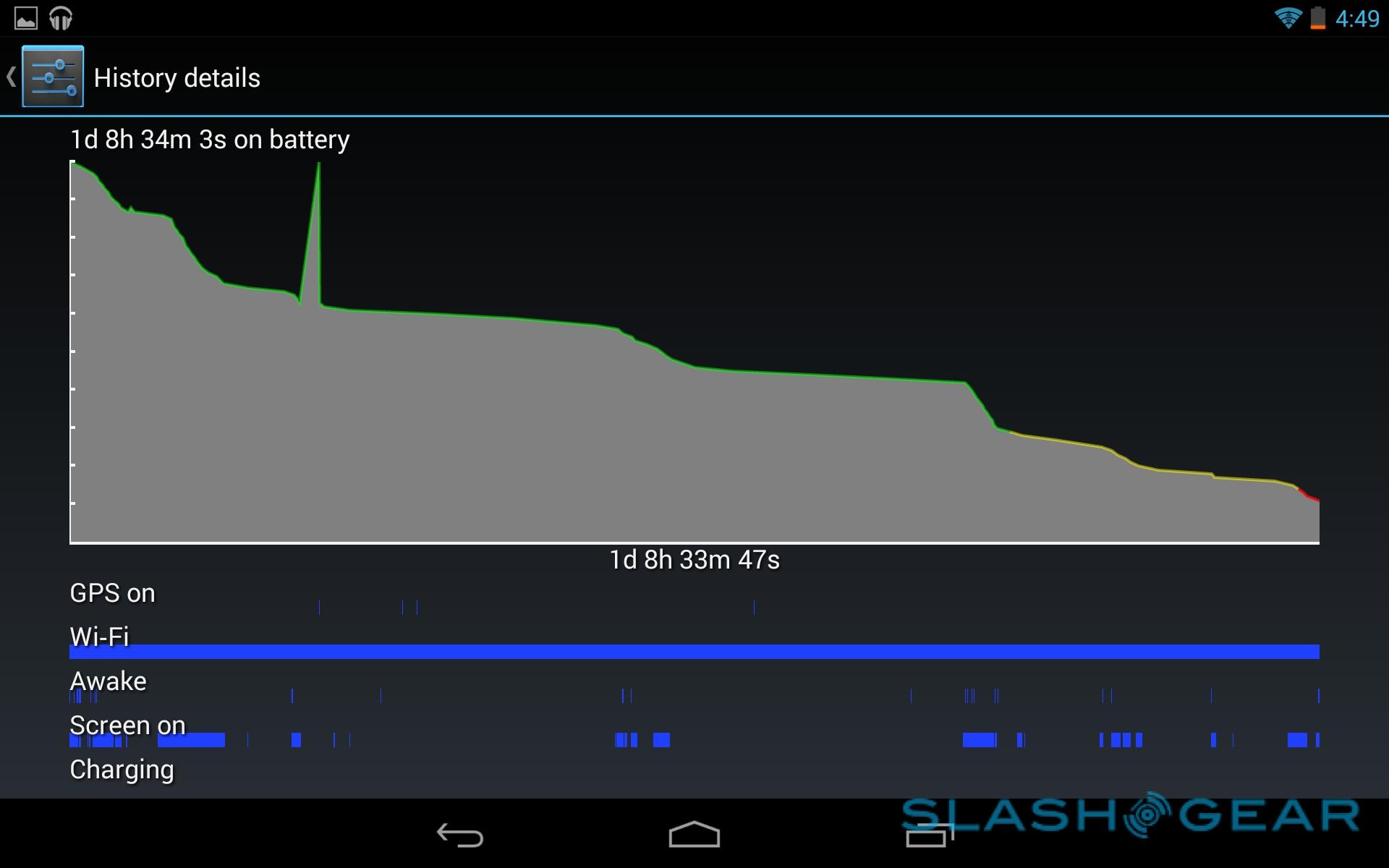Google quotes up to nine hours of HD video playback or up to ten hours of web-browsing from a full charge. Our own testing suggests these are pretty accurate estimates; with heavy use, including Netflix media streaming over WiFi, push email and social networking turned on, some photography, and browsing, we managed almost nine hours of use before the 2013 Nexus 7 ran out.