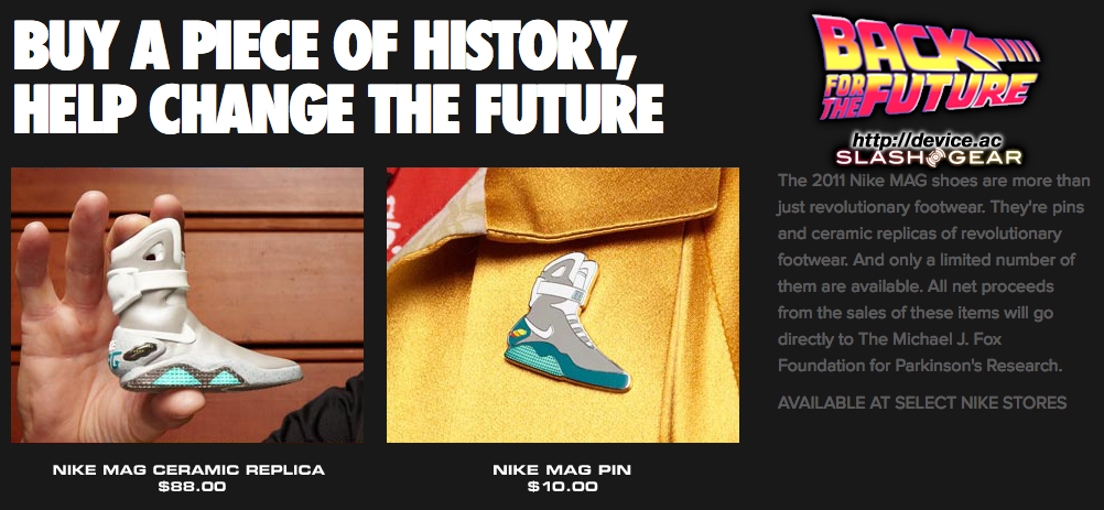 Then head to the NikeMag Back For The Future site to pick yourself up a pair and support the MJF Foundation for Parkinson's Research! Also note that you can check out an extremely well designed Flash-based website for this project over at http://www.back4thefuture.com/ AND that you'll be able to purchase a NIKE MAG ceramic replica of the shoe for $88 USD or a NIKE MAG pin for $10 USD, all of the net sales, again, going to the MJF Foundation.