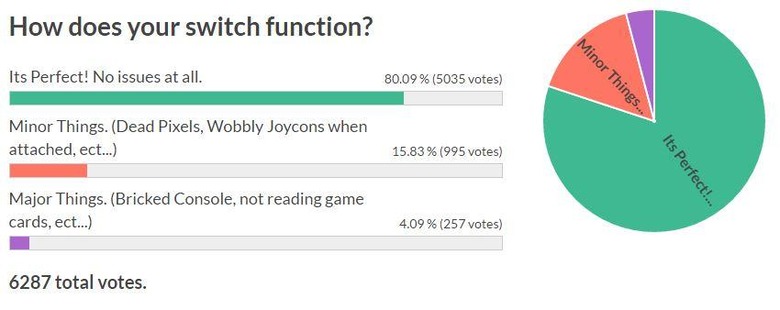 The problems range from syncing issues and poor WiFi connections to more frustrating problems like dead pixels and bent docks that leave scratches on the Switch display. These problems understandably have folks upset, and right now a not insignificant 20% of respondents to that Straw Poll (out of around 6300 total at the time of this writing) say that their Switch is suffering from some kind of issue, be it minor or major.