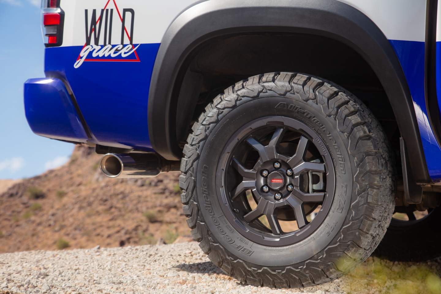 The list includes 17-inch NISMO off-road AXIS wheels, a NISMO performance exhaust system, a NISMO suspension kit, and a four-inch NISMO off-road lighting kit. Team Wild Grace's Frontier PRO-4X sits two inches higher off the ground and has a more aggressive exhaust sound than stock.