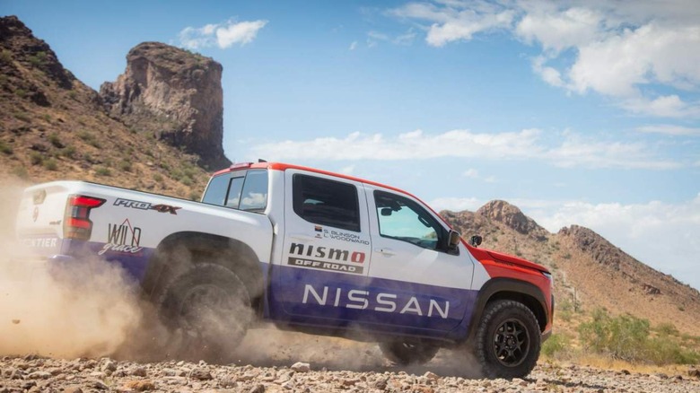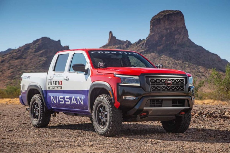 Starting with a brand-new 2022 Nissan Frontier PRO-4X with standard LED lighting, LED fog lights, Bilstein off-road shock absorbers, skid plates, and an electronic locking differential, the vehicle gets a moderate sprinkling of NISMO off-road parts.