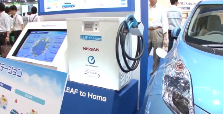 The large capacity battery in Nissan's LEAF electric vehicle will soon be able to power entire homes. Nichicon has developed a new Vehicle to Home System called "EV Power Station" that can both charge and discharge the EV's batteries, distributing its electricity to the household. The EV Power Station is said to be the world's first such charging device capable of supplying household power.