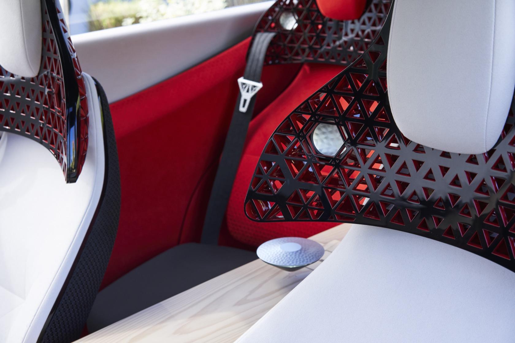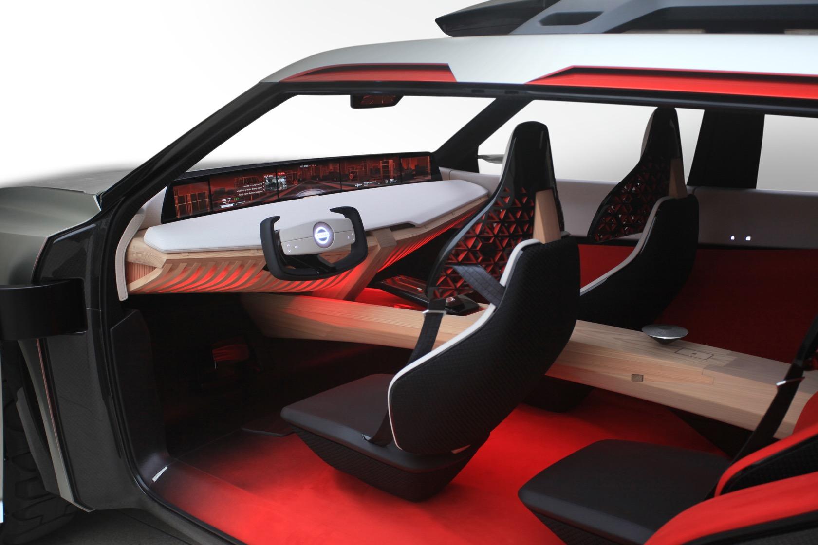 As for the seats, they have transparent panels and scarlet red paint, echoing traditional lacquer. Open the rear doors and you can even see a hidden landscape – Mt. Fuji, in fact – at the third row. When the seats are occupied, Nissan's infotainment system automatically turns on motion-operated controls for multimedia and HVAC.