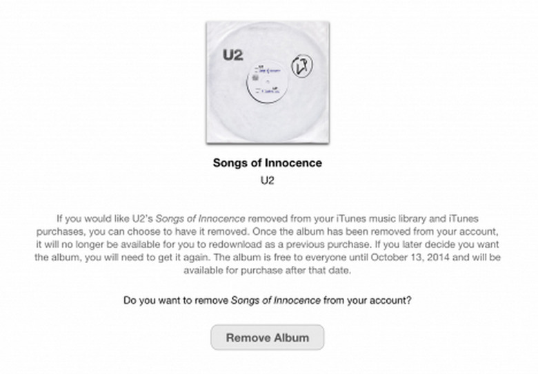 In response to masses of complaints from users in that particular situation, Apple created an Album removal tool unique to the U2 track collection. The album will stop being "free" to iTunes users on the 13th of October, 2014.